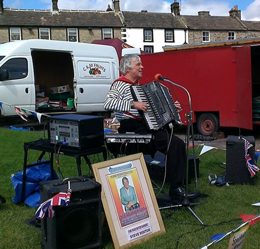 Steve Roxton was perfoming in Reeth in the first start of the Tour De France Race in Yorkshire. Steve was filmed by Sky News and was also spotted and heard singing and playing in background of the Sky News live broadcasts from Reeth. Steve played for 4 hours Entertaining the crowds in Reeth as the cyclist went past on Saturday 5th July. Accordionist Karen Street was also entertaining