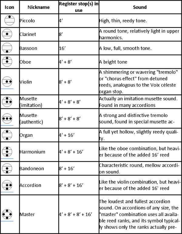 Here are some common register symbols that you might find on your accordion, along with their name, the stops in use and a description of the sound.