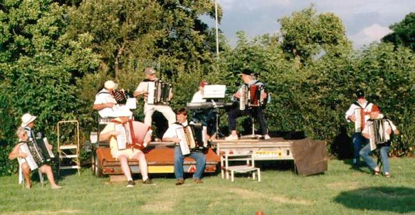 “Our 8th April night started with Leo and Les Thurston playing Tulips from Amsterdam on their MIDI accordions, followed by a German Tango, Summertime and House of the Homeland, Leo and Les also play, and have recorded, a tape under the name The Klavaccords. Next Frank Scholes played a folk dance tune and Lord of the Dance. Frank