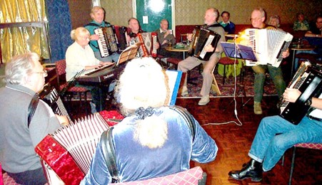 the Mood and a James Last medley. Basil recently wrote a magazine article about his vision of a new accordion for the future, this was a 48 Bass Electronic instrument with auto rhythms built in and a simplified Bass side. If you would like more information on this idea then have a word with Basil at the club, I am sure he will be interested in sharing his ideas with you. After the break, Jay and Jeff opened the second half with Happy Birthday for a surprised Lady in the club. Walter Perrie and